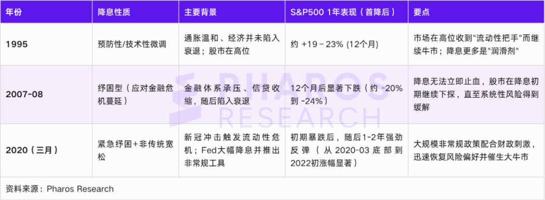 9 月 17 日,美联储实施本轮首次预防性降息 25bp 至 4.00–4.25%。经验显示,预防性降息更易对应软着陆与股市上行(如 1995 年),而危机型降息(2007–08 年)难以提振风险资产。[2]