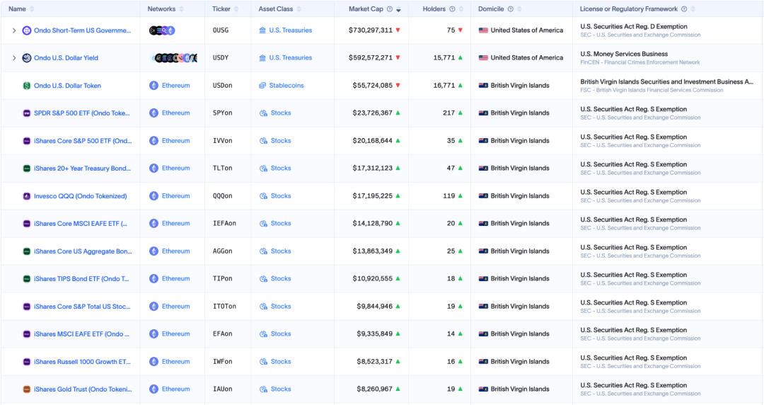 以 Ondo 为代表的发行与运营样本正在形成商业闭环:据行业数据(DefiLlama 口径),Ondo 过去一年收入约 5,553 万美元,主要来自管理费与收益差(Yield Spread)。[7]其业务重心仍是两款与美国短期国债相关的核心产品:OUSG 与 USDY。[4]平台提供链下托管、链上清算和企业行动(分红)自动分配,并构建 KYC 白名单和受限转让规则,是目前股权代币市场的领先者。