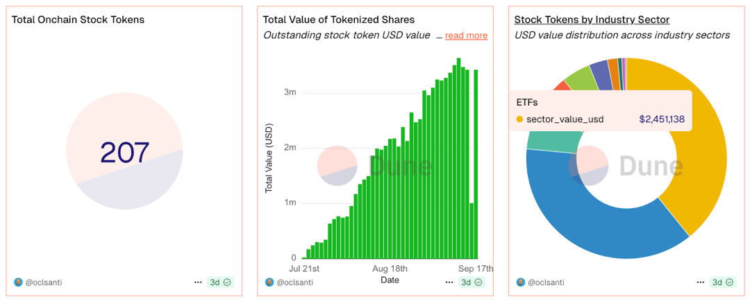 Robinhood(EU):面向欧盟用户的美股/ETF 代币,首发于 Arbitrum L2,零佣金,提供 24×5 交易;后续计划迁移至自研 L2,实现 24×7 交易、自托管与跨链提现。每份代币对应 1:1 实股(存于经纪账户),严格执行白名单机制;早期代币不赋予投票权。链上合约数量约 207 个,其中有效标的超过 200 个。[6]