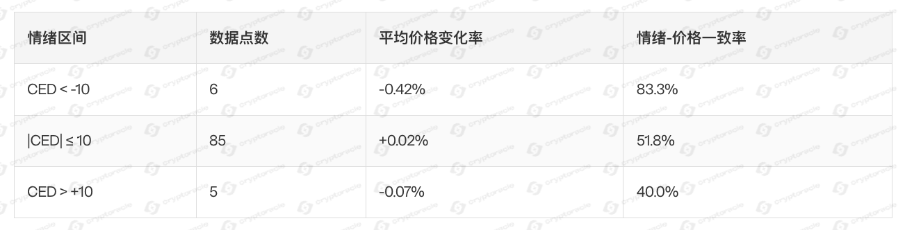 - 极端负情绪(CED < -10)与价格下跌高度同步(一致率83.3%),且平均跌幅显著