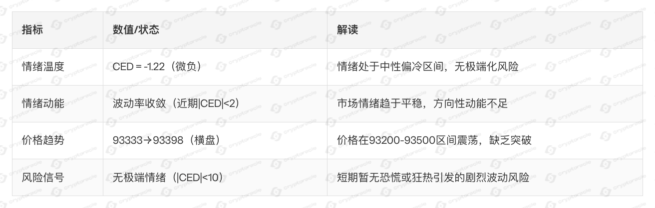 - 凌晨至清晨(02:00-09:45):情绪修复至中性区间(|CED|<5),价格震荡企稳