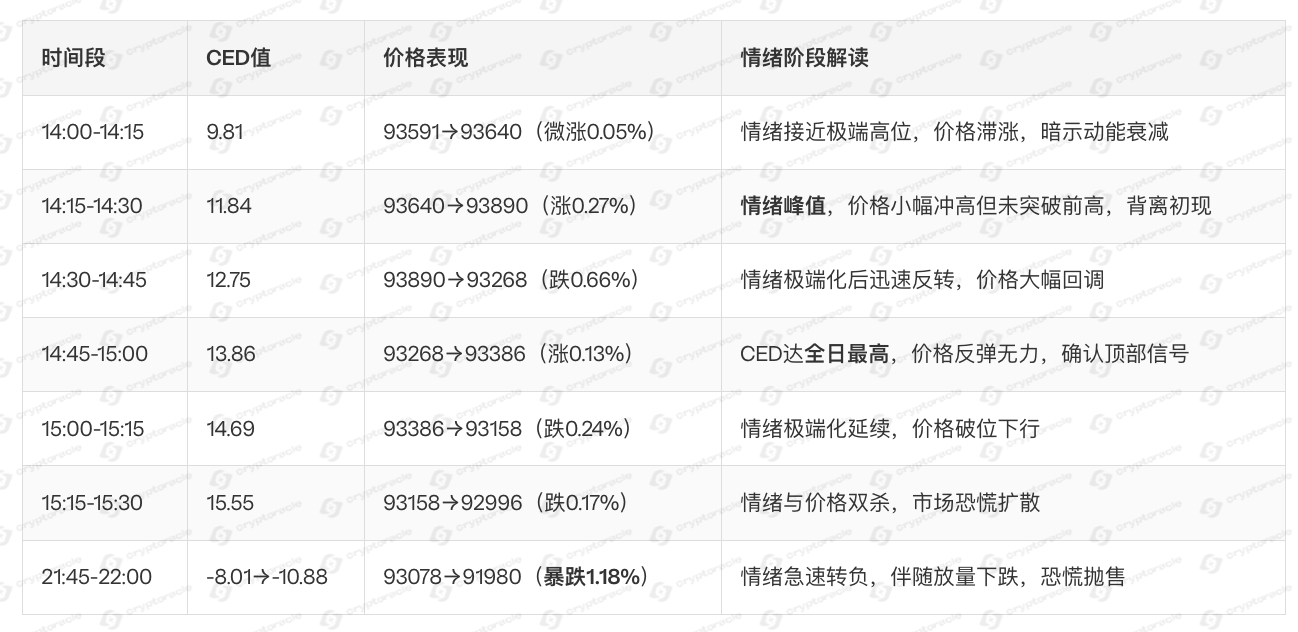 - 午后至傍晚(12:00-18:00):情绪加速冲高(CED突破10并升至15.55),价格见顶回落
