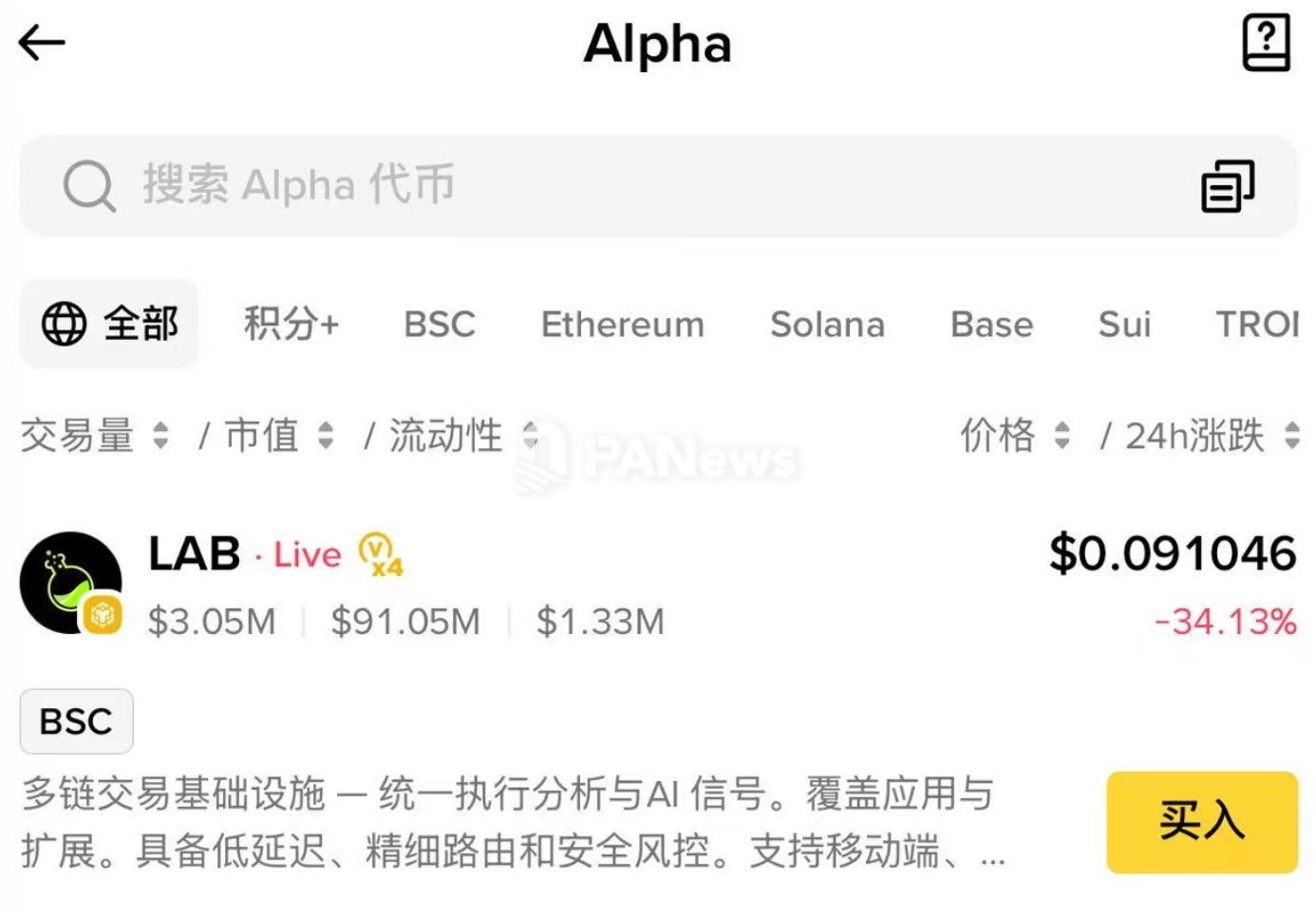 PANews 10月14日消息,币安APP页面显示,Binance Alpha已上线LAB(LAB)。