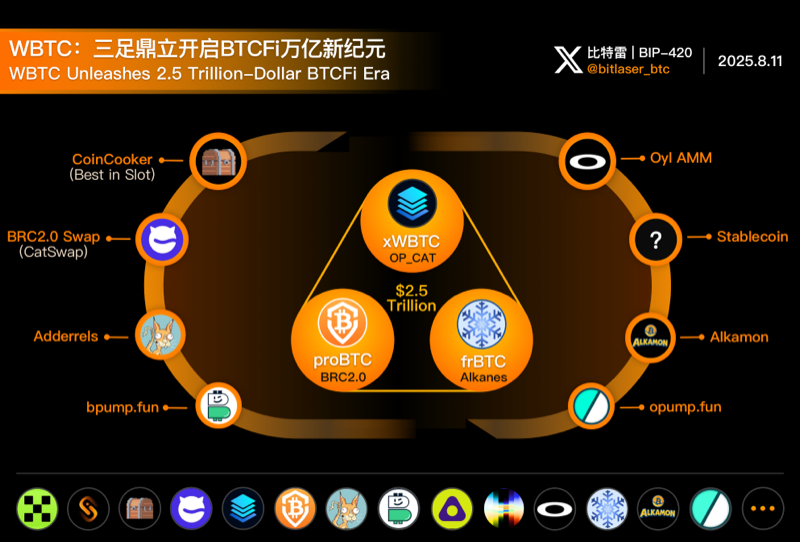 Bitcoin DeFi=DeFi协议+WBTC,随着BRC2.0、Alkanes等DeFi协议的成熟,WBTC已经成为解锁2.5万亿美元BTC进入BTCFi的关键因素,WBTC 被100Layer @100_Layer、proBTC @proBTC_org、frBTC @SUBFROSTio引入已成定局,2025年必定成为BTCFiSummer元年。