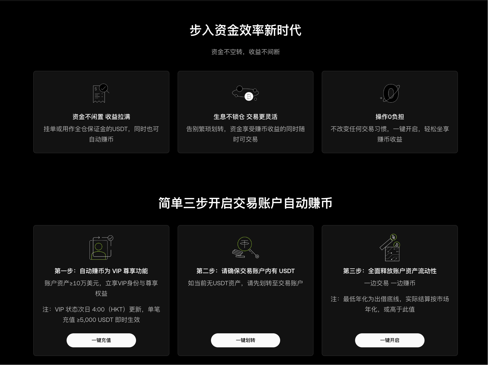 所以,无论交易型用户,还是持有型用户,交易账户里闲置的 USDT 都可自动生息。