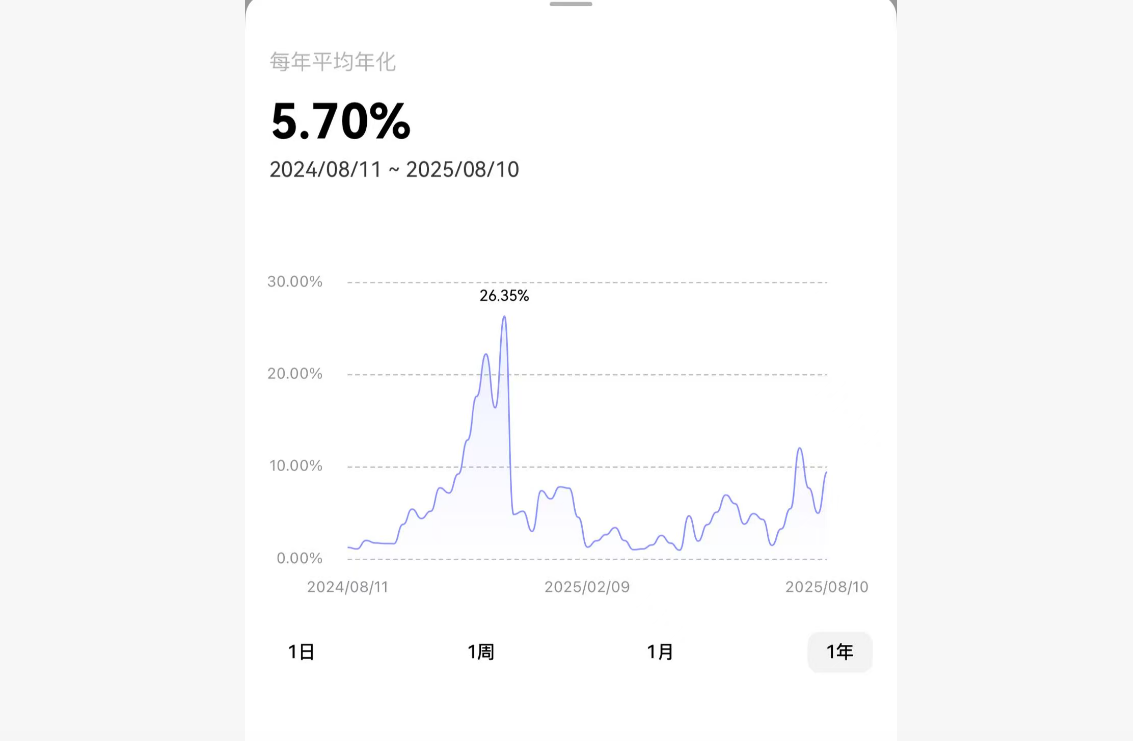 OKX APP数据显示,从 2024 年 8 月 11 日到 2025 年 8 月 10 日,USDT 简单赚币的平均年化收益是 5.70%。这一年里收益率起伏不小,最高曾冲到 26.35%。在一些特殊行情下,年化收益甚至会在当天的某些时段飙到 50% 左右,比平时高出好几倍。
