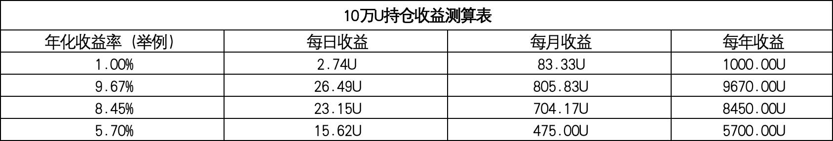 更利好大资金:收益率越高,大资金带来的回报差距会非常明显。拿 10 万 U 来说,年化从 1% 涨到 9.67%,每天赚的利息就从 2.74 U 涨到 26.49 U,一年下来从 1000 U 直接飙到 9670 U。只要年化多涨几个百分点,收益就能增加。