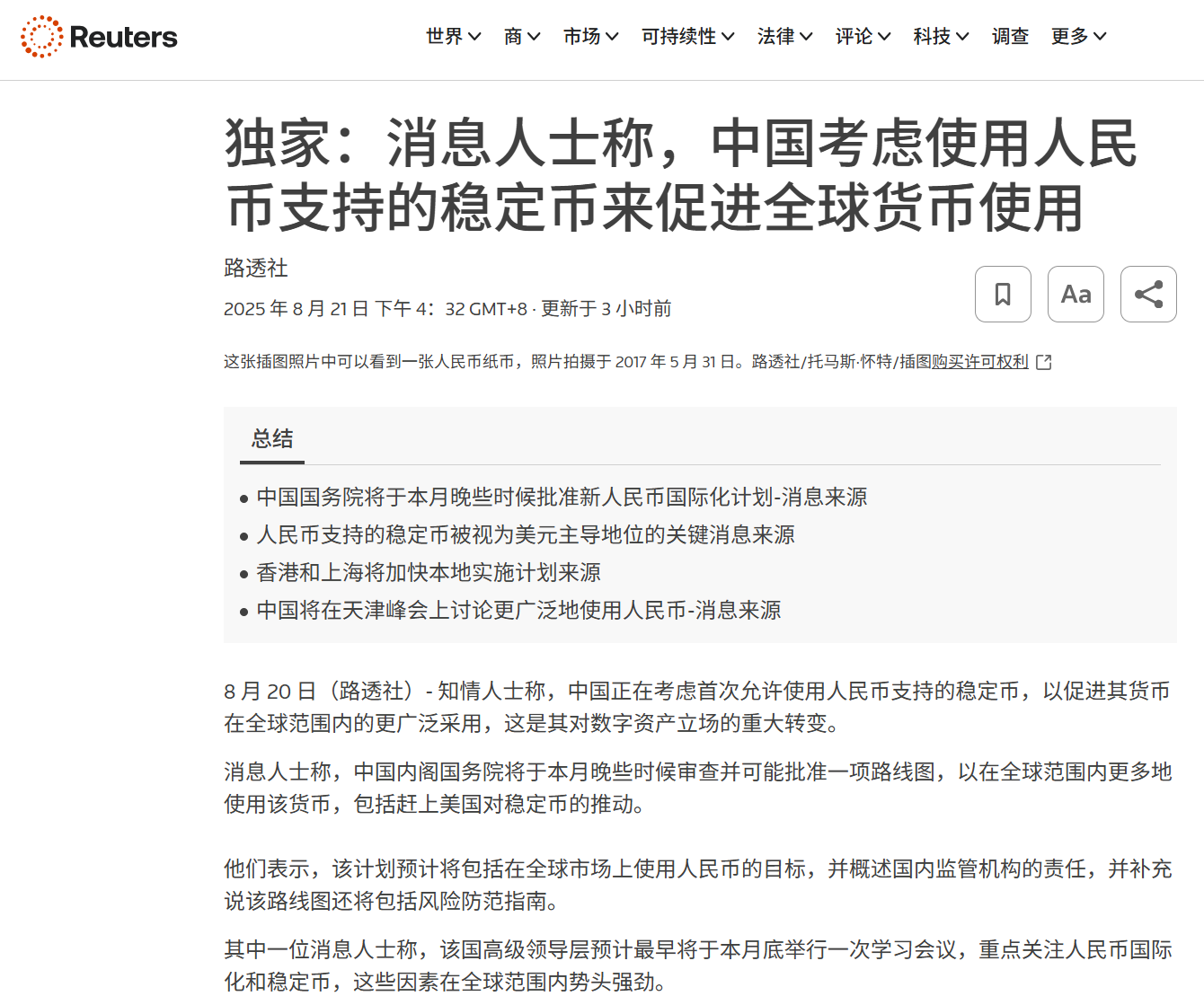 昨天,据路透社称:中国考虑推出人民币支持的稳定币,以促进全球货币使用。