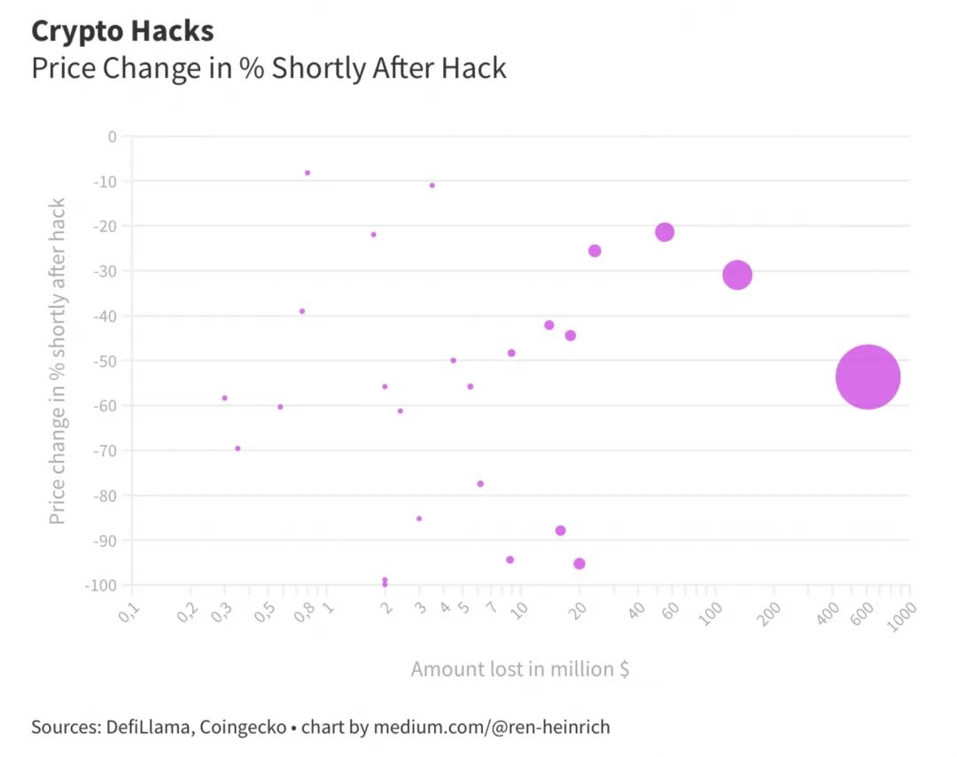 下面的图表显示了黑客攻击后几天价格达到局部底部的情况。资金损失的数额似乎与价格下跌无关。