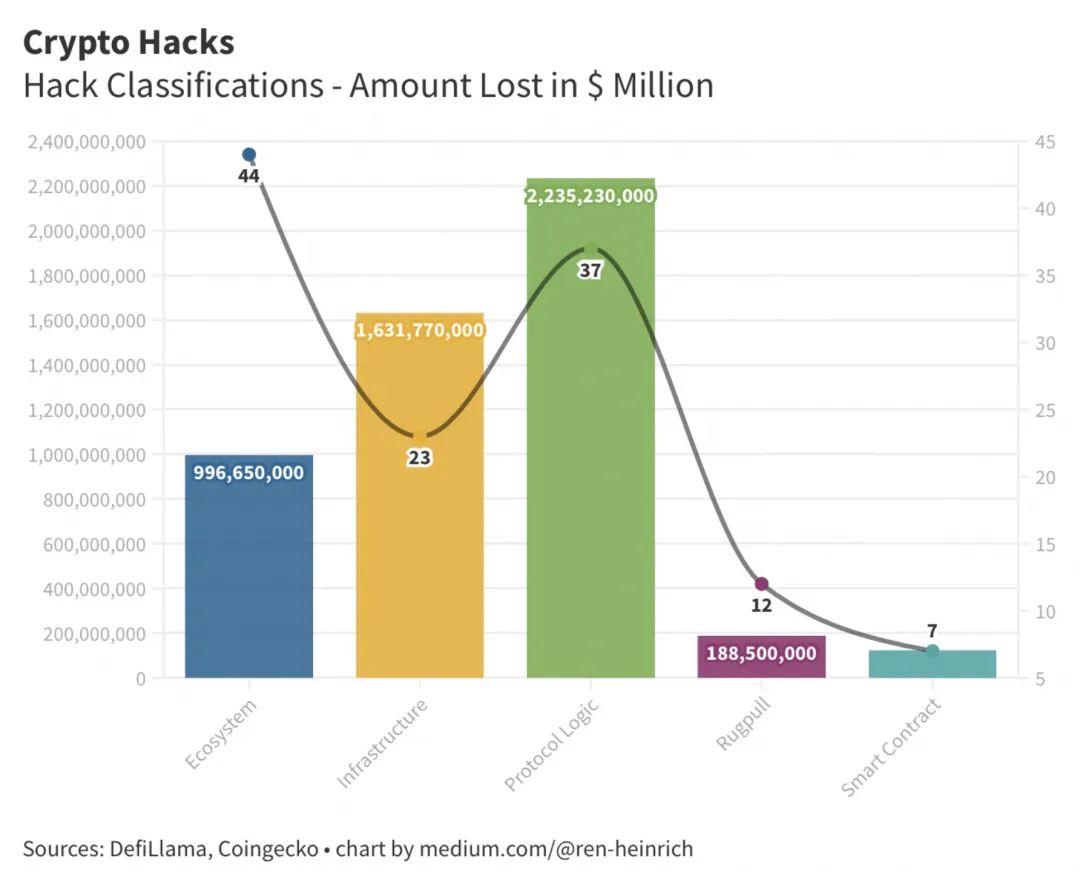 数据显示,协议逻辑中的错误为潜在的攻击者提供了最大的攻击面,37次协议逻辑黑客攻击导致了超过20亿美元的损失。