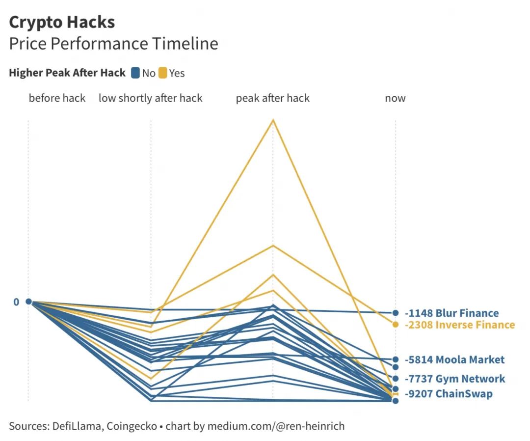 然而,绝大多数项目从未达到与黑客入侵前相同或更高的价格水平(蓝色线)。这意味着一旦信任消失,在大多数情况下,它将永远不会回来。