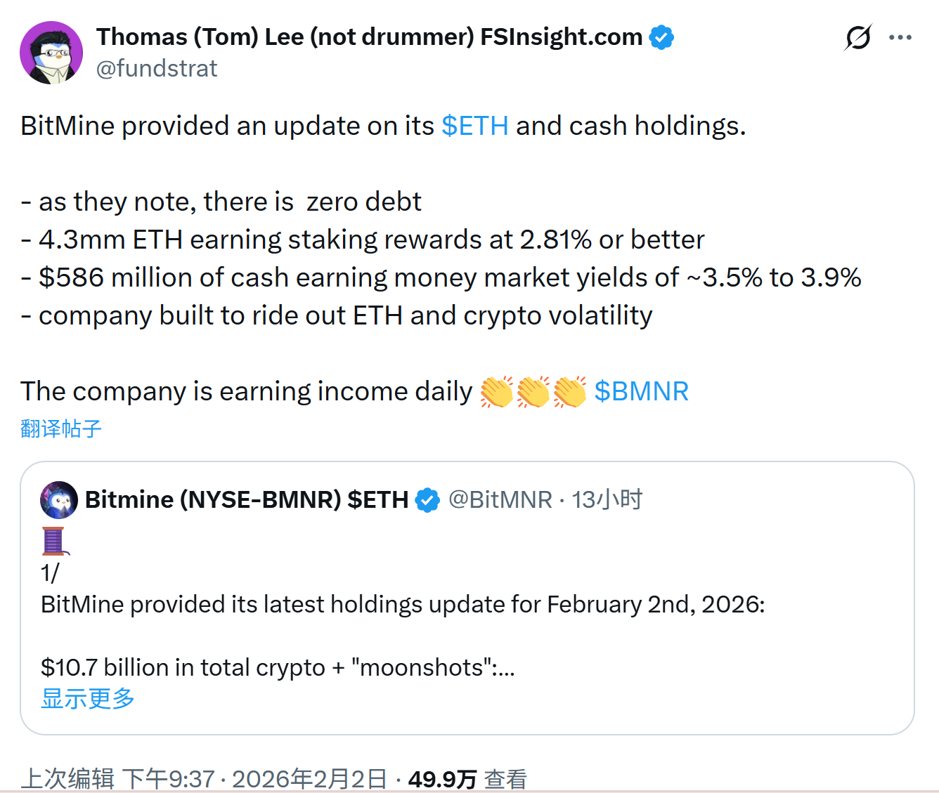 事实也的确如此,与多数市场想象不同的是,BitMine 的结构并不激进。正如 Tom Lee 在 2 月 2 日的社交发帖所强调:他们拥有 5.86 亿美元的现金储备,且 67% 的 ETH 处于质押中,每天能产生超过 100 万美元的现金流,对他而言,下跌只是账面数字的缩水,而非生存危机的降临。