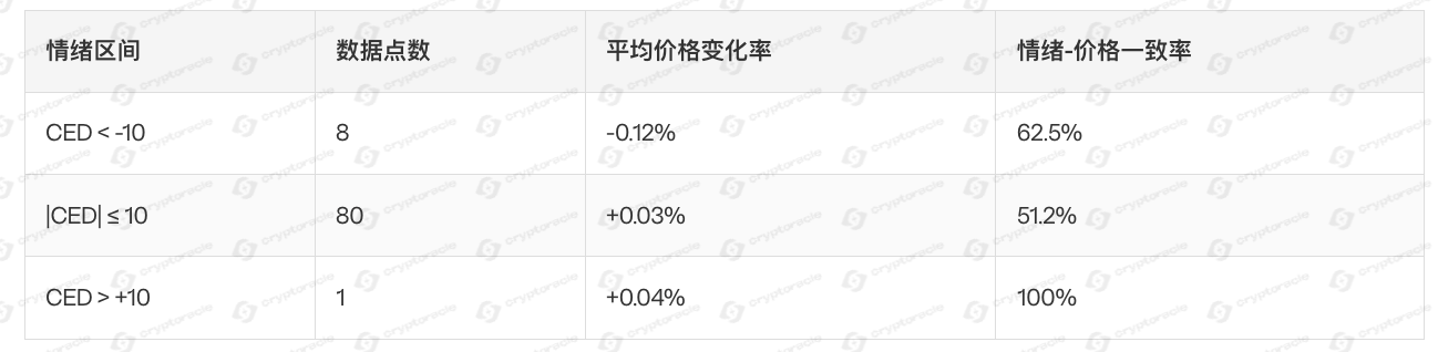 - 极端负情绪区间(CED<-10)价格下跌概率显着偏高,平均跌幅0.12%
