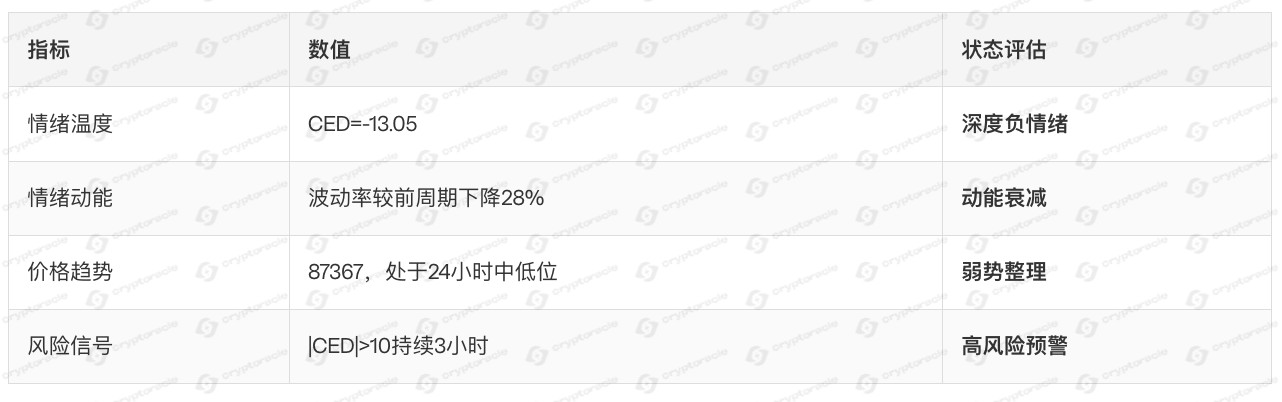 过去24小时内,BTC市场情绪呈现先稳后跌再反弹的V型走势。整体偏负,CED从初始的12.27持续下行至最低-15.14,尾盘略有修复至-13.05。