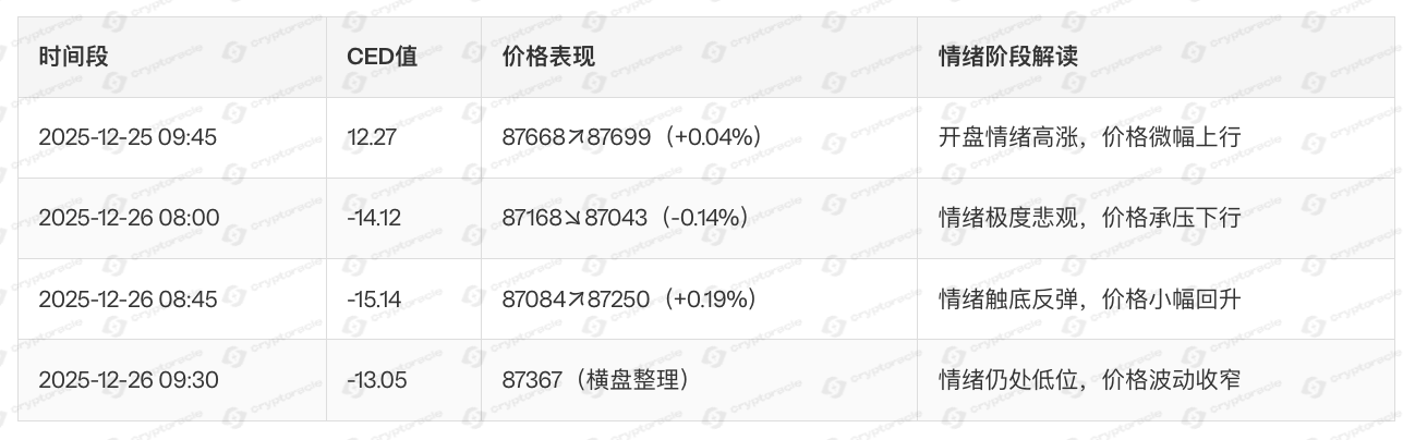 - 午后至傍晚(12:00-20:00):情绪持续走弱(CED 7.12→-5.64),价格缓步下行