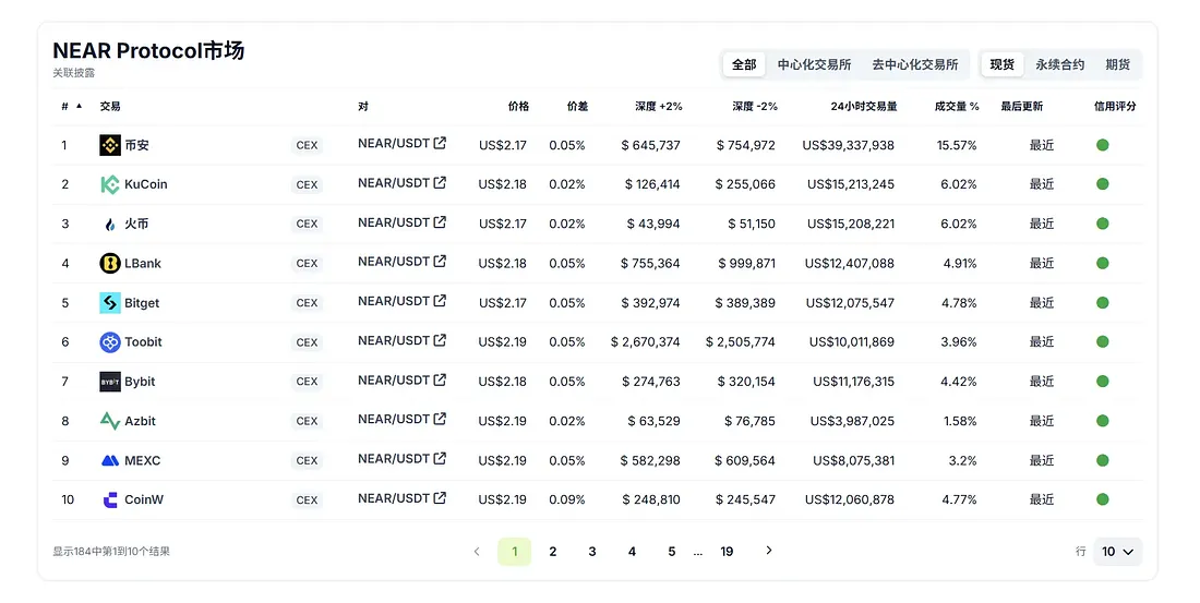 Near 基本覆盖了所有的行业主流交易所,并在各个交易对都拥有很好的流动性支撑;相比于同 FDV 的其他项目,NEAR 在深度方面处于领先地位。