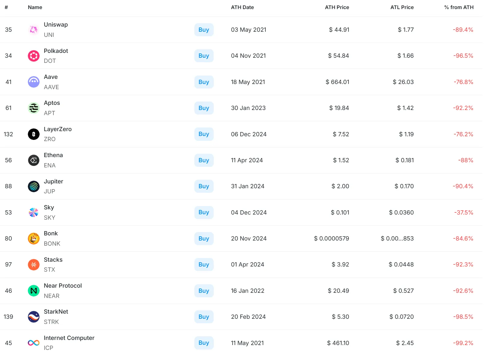 加密代币市值前150的各个叙事赛道龙头当前价格相对最高价格跌幅
