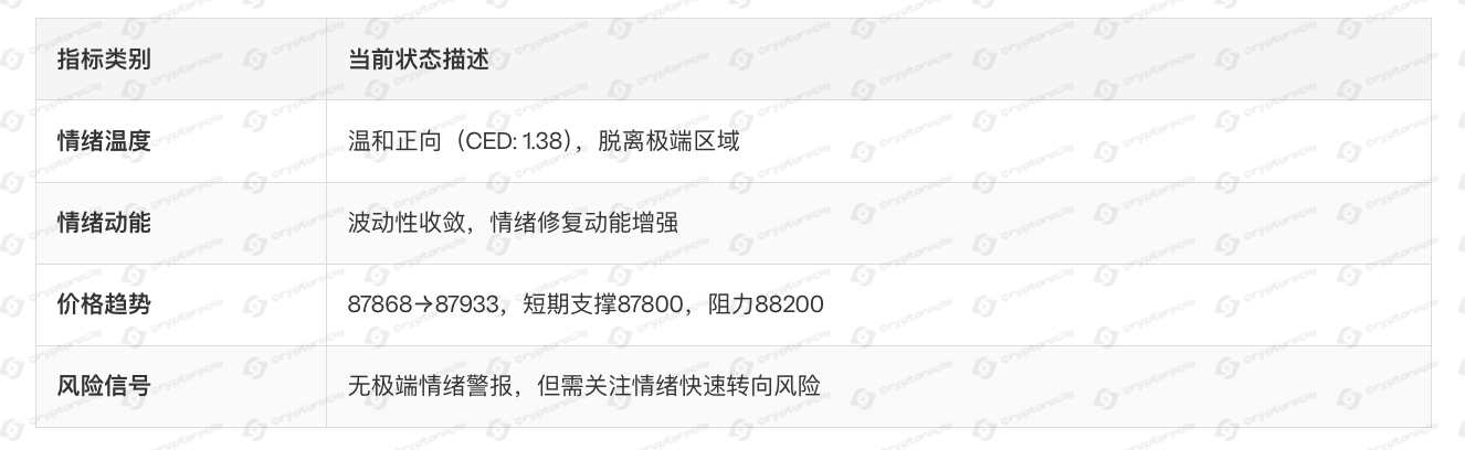 过去24小时内,BTC市场情绪呈现先负后正的V型反转格局。早期情绪深度负向(CED最低至-15.45),午后逐步修复,尾盘转为正向累积。