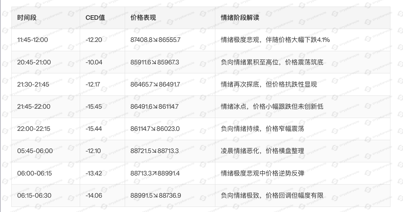 - 午后震荡修复:12:00-18:00情绪在负区间反复,价格企稳