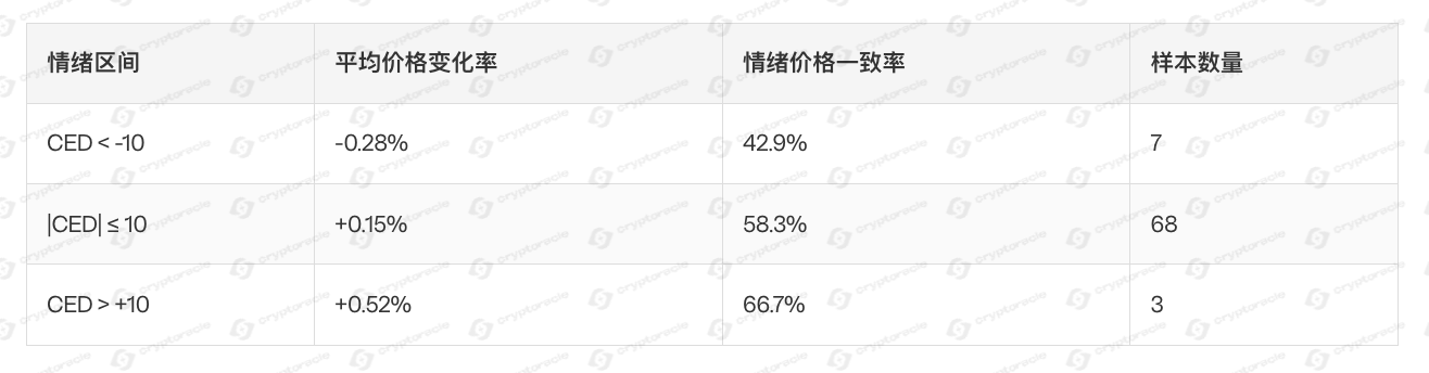- 正向情绪极端化伴随强势上涨 - CED>+10时价格平均涨幅最大