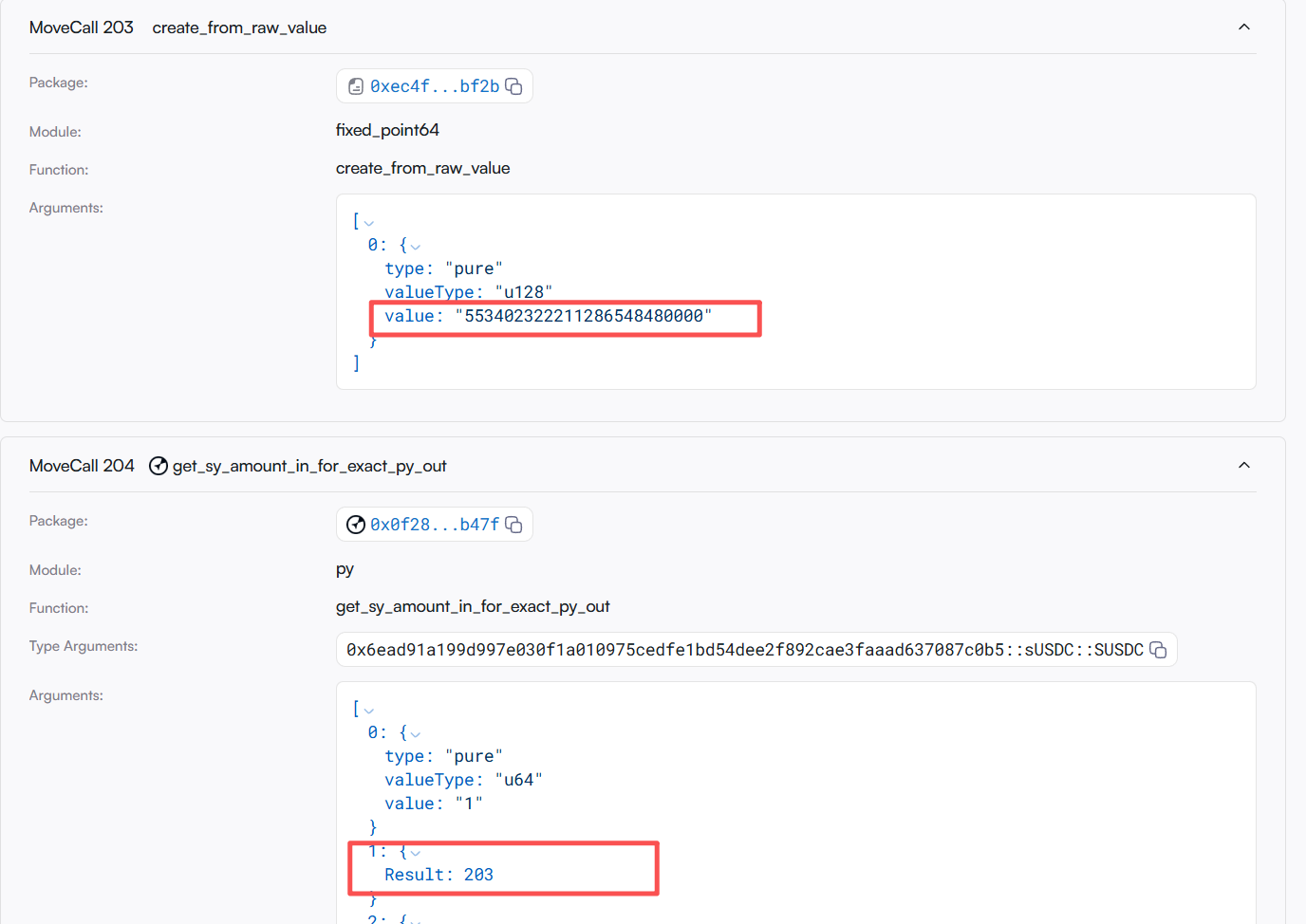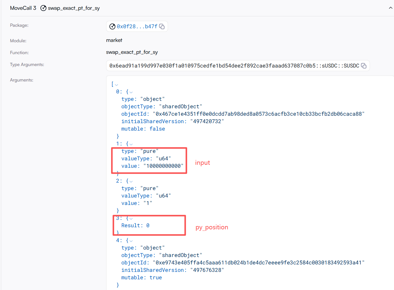 4.通过py.get_sy_amount_in_for_exact_py_out计算出PY输出所需要的SY的输入量,这里攻击者将py_index传入一个构造的极大的数553402322211286548480000,破坏了原本的结构。