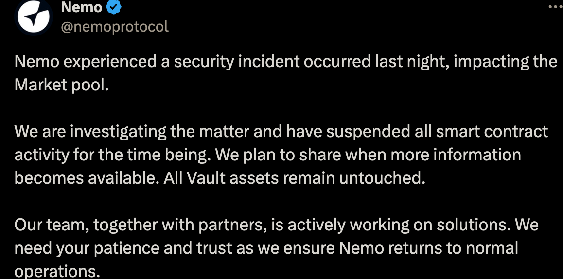 在攻击发生后Nemo团队紧急暂停了智能合约功能,并开始调查攻击事件。调查结果表明259万美元资产损失攻击源于在未充分审计的情况下上线新功能。