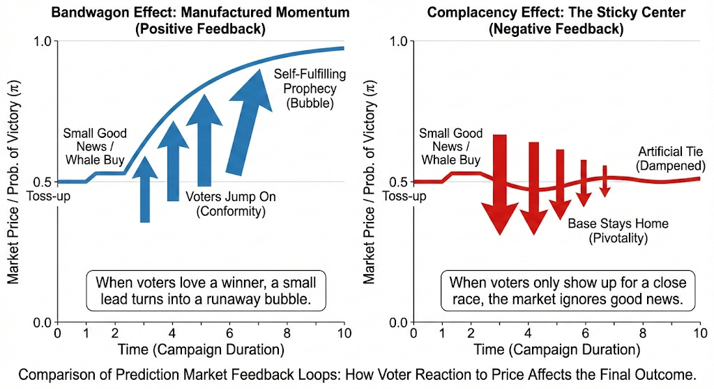如果受欢迎有助于候选人获得更多支持,那么在新闻中播报预测市场的价格就会产生一种推高这些价格的动机。操纵者可能会试图抬高其支持的候选人的胜算,希望引发一个反馈循环:市场价格上涨→选民察觉到势头→选民转移支持→价格再次上涨。