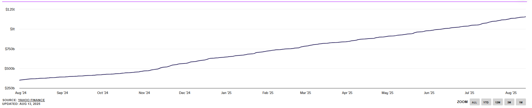 随后,在7月中旬美国国会通过了首个稳定币监管法案《天才法案》,为以美国资产做为支撑的稳定币作为国际转账的支付手段铺平了道路后,以太币后来居上,机构开始大举增持。原因主要在于,稳定币USDC是建立在以太坊的区块链上,其发行方Circle已于6月初上市,其股价一度飙升逾500%。根据雅虎统计,以太币ETF累计流入额自7月15日的1,000亿美元,飙至8月12日的1415亿美元,并在当日创下5750万美元的历史新高单日流入。