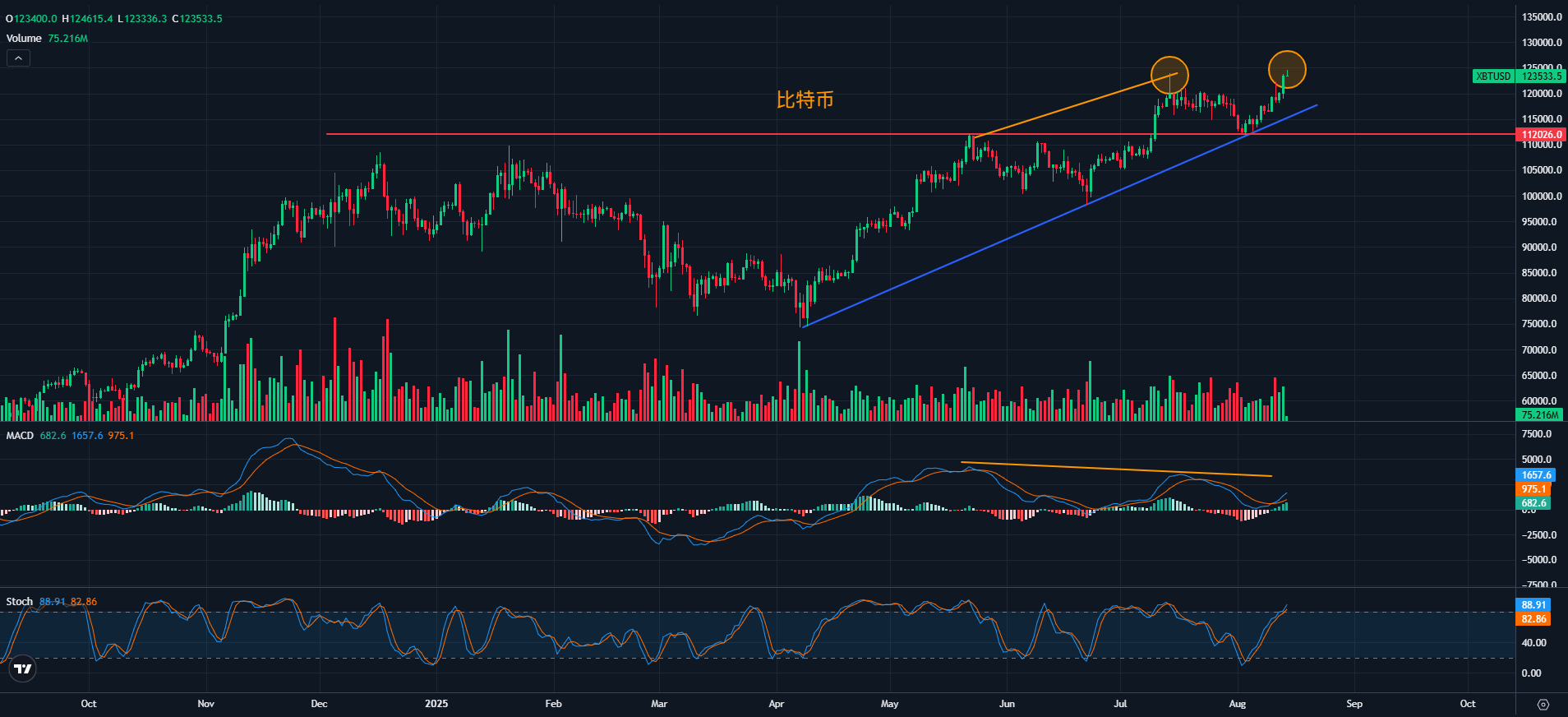 其次,从技术层面分析(如下图),比特币的价格走势与MACD形成潜在的熊背离走势,当前价格有可能与7月份高点形成双顶形态,从而引发回调。近期的潜在支持位置在8月2日低点,该位置亦为5月份高点,约11.2万美元。蓝色的上行趋势线为关键支撑,若跌破则有望进一步走跌。