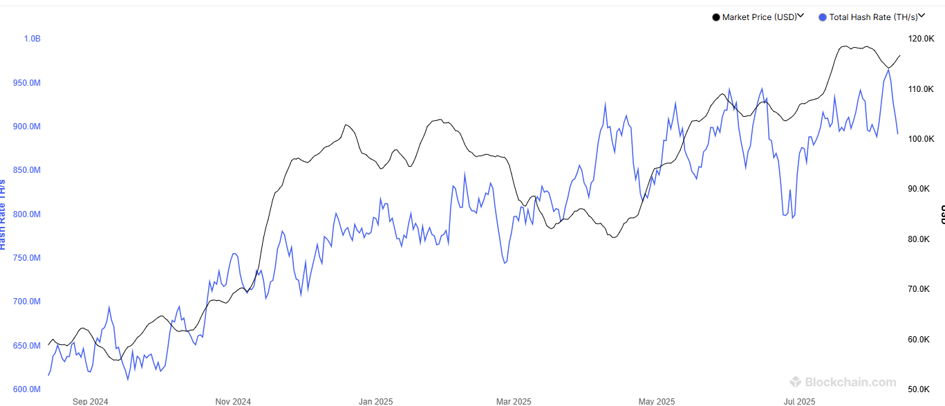 虽然长期基本面对比特币带来强劲支撑,但短期内存在回调压力。首先,据Blockchain.com的统计,比特币算力自8月7日以来迅速下滑,有最高9.65亿太赫兹每秒下降至8月13日的8.92亿太赫兹每秒。由于比特币算力与比特币价格通常为正相关,当前走势暗示短期价格可能面临回撤风险。