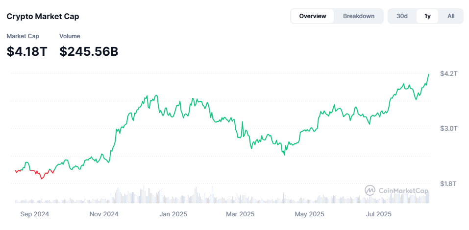 在美国公布了低于市场预期的7月份通胀数据后,投资者对美联储将在9月份再次降息的预期显著升温,全球投资风险偏好持续增强。伴随美股连续创新高,加密货币市场更显强劲。根据CoinMarketCap的数据,周四亚太市场早盘时段,全球加密货币市场总市值刷新纪录,突破4.18万亿美元,成交量达2,450亿美元。