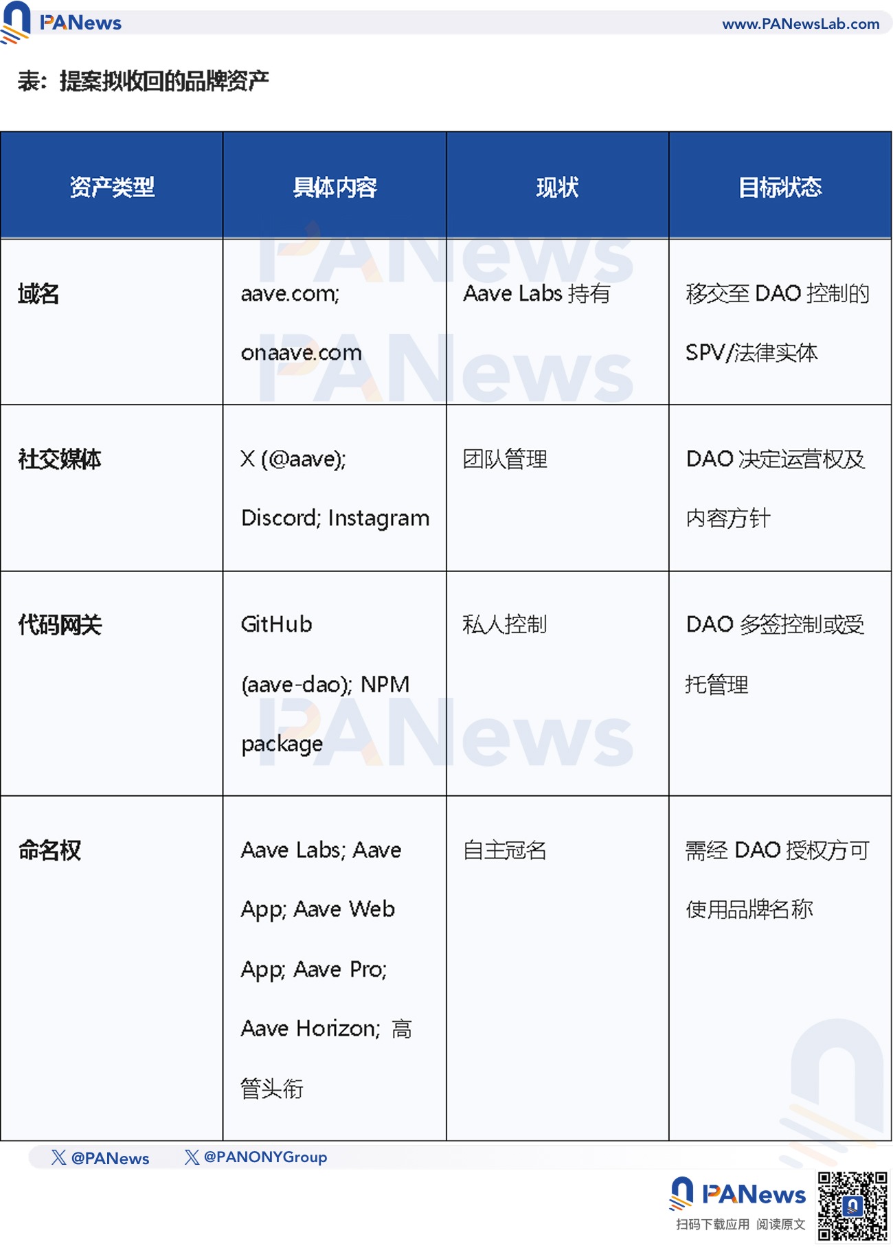 Aave或将更进一步,其试图通过“第一阶段—所有权”提案,从法律根源上解决“谁才是品牌主人”的问题。如果未来提案通过,Labs的任何商业化举动,都必须在程序层面获得DAO的授权,这也将从根本上终结“隐形私有化”的可能性。