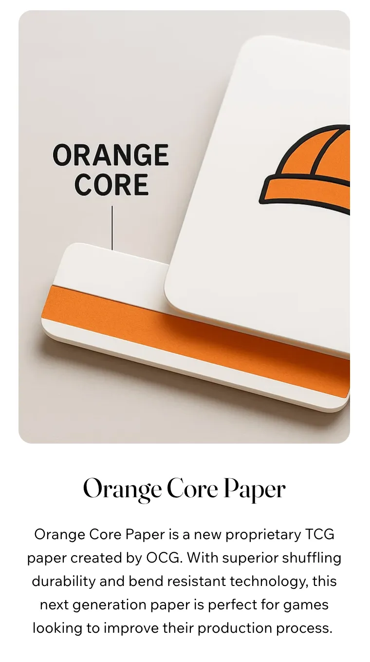 为了使其交易卡游戏脱颖而出,该公司避开了行业标准的蓝芯卡纸,转而开发了自己的橙芯材料。这种专有卡纸减少了边缘磨损和卡片弯曲等常见问题。Orange Cap Games控制着材料选择和制造过程,将产品所有权延伸到生产细节。