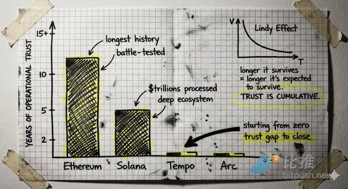 从头构建一条新的 Layer 1 意味着信任要从零开始重建。区块链是信任机器,而信任是通过运行积累的。它源于多年没有灾难性失效的记录,源于在没有漏洞的情况下保障了数十亿资金,源于深刻理解边界情况的开发者生态,源于经受住攻击洗礼的代码。这是应用于基础设施的林迪效应(Lindy effect)。