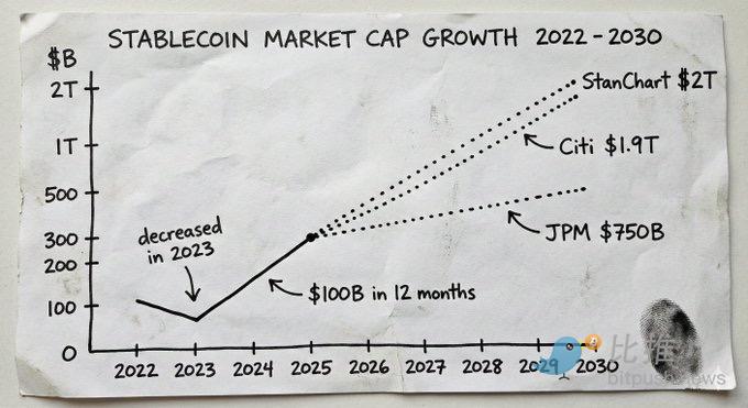 2025年,稳定币市场规模突破了3000亿美元,而年初时仅为2050亿美元。在不到十二个月的时间里,新增供应量接近1000亿美元。