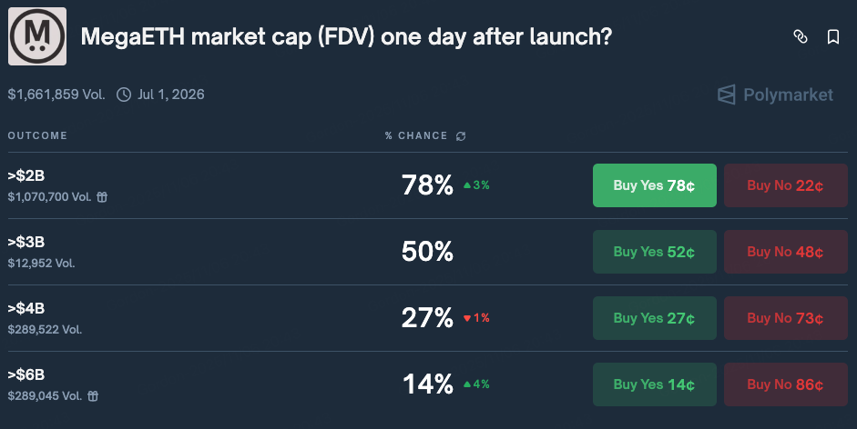 Mega的价格区间和市场估值可以从多个角度进行推测与分析。首先,从公募轮定价来看官方宣布将对所有出价低于9.99亿美元的用户进行退款,这一举措相当于设定了项目的估值底线,意味着公募轮的估值大概率将高于9.99亿美元,市场普遍预期其初始市值会在十亿美元级别起步。其次,从市场预期层面来看,Polymarket的预测数据显示,MEGA代币在上线后24小时内实现全流通市值突破20亿美元的概率高达78%。最后,从二级市场的盘前交易情况来看,截至11月7日Hyperliquid上的MEGA盘前市场的全流通市值约为39亿美元。