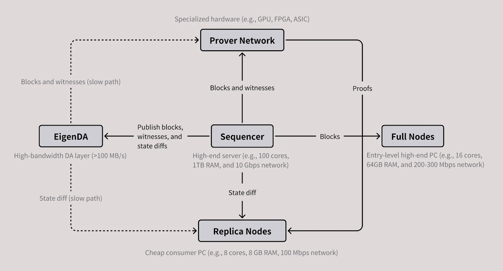 在传统的区块链(L1)中,每个节点都要做同样的事情:参与共识、执行交易、验证区块。这样虽然安全,但速度很慢,因为所有节点都在重复工作。而 L2 网络的设计更灵活,不同节点可以分工协作,让系统更高效。例如,一些节点专门排序交易(Sequencer),另一些节点专门生成或验证证明(Prover)。MegaETH在这个基础上往前走了一步,引入了一种新的“副本节点”(Replica Node)。它们不用重新执行每笔交易,而是从排序节点那里接收交易结果,只需验证数据是否正确。这让同步速度更快、硬件要求更低。在 MegaETH 中,一共有四种节点: