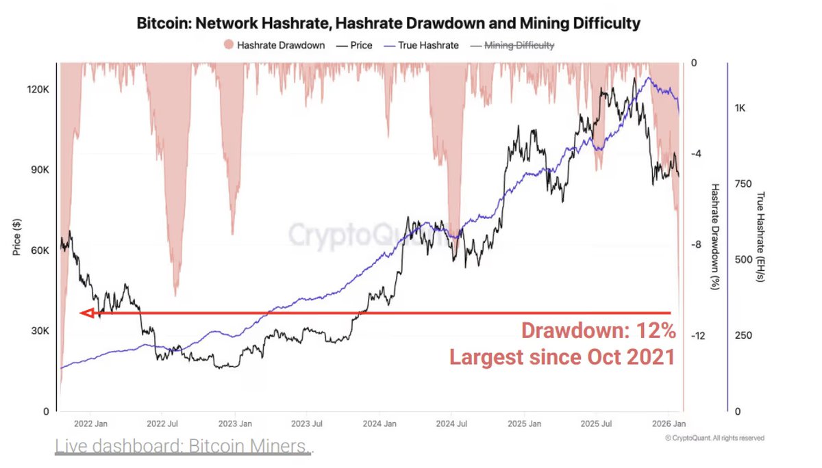 PANews 2月1日消息, 据 Coin Bureau 报道,自 11 月 11 日以来,BTC 的总网络算力下降了约 12%,创下了自 2021 年 10 月以来的最大跌幅。