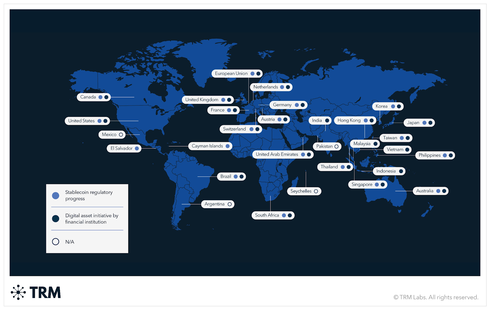 根据 TRM Labs 于 2025 年发布的一份全球加密政策回顾报告(覆盖 30 个司法辖区),超过 70% 的司法辖区 在当年将稳定币监管列为重点议题。这一比例清晰表明,围绕数字现金与支付基础设施的监管共识正在全球范围内逐步形成。