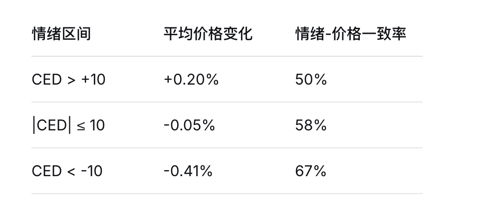 情绪极端化阶段往往预示价格反转,当CED突破±10阈值后价格往往向相反方向运行。负情绪冲击力大于正情绪,CED<-10阶段价格跌幅明显大于CED>+10阶段的涨幅。中度情绪区间主导市场但价格方向预测性较弱。