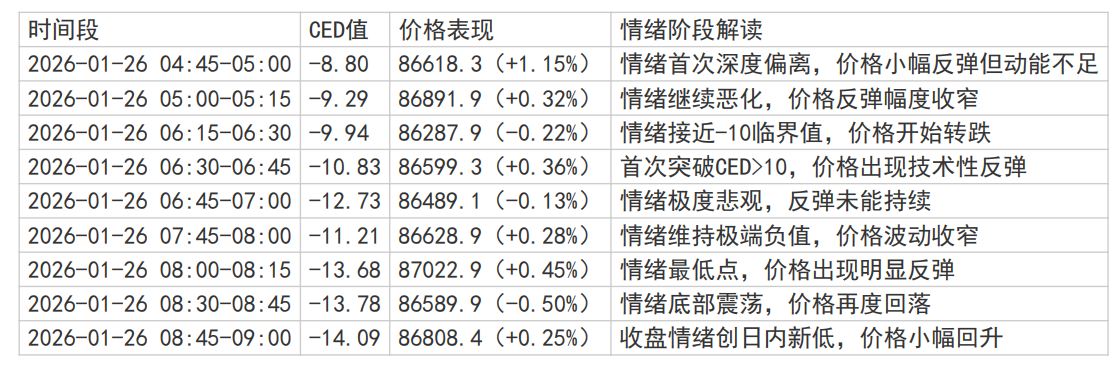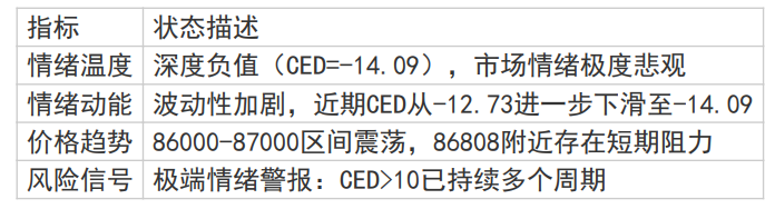 - 早盘(04:00-09:00):情绪极端恶化(CED>10),价格在86000-87000区间寻求支撑