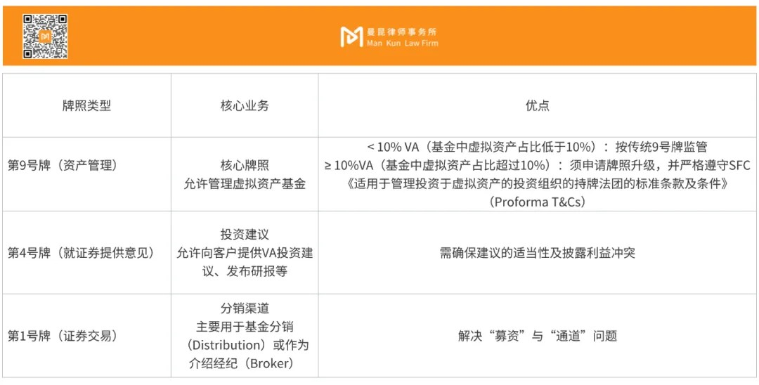 在SFC的监管体系下,涉及虚拟资产活动的牌照主要分为两类:一是以交易所为核心的1+7号牌(VATP, Virtual Asset Trading Platform),门槛极高、申请难度极大;二是以资产管理为核心的1、4、9号牌照。本文重点讨论后者。