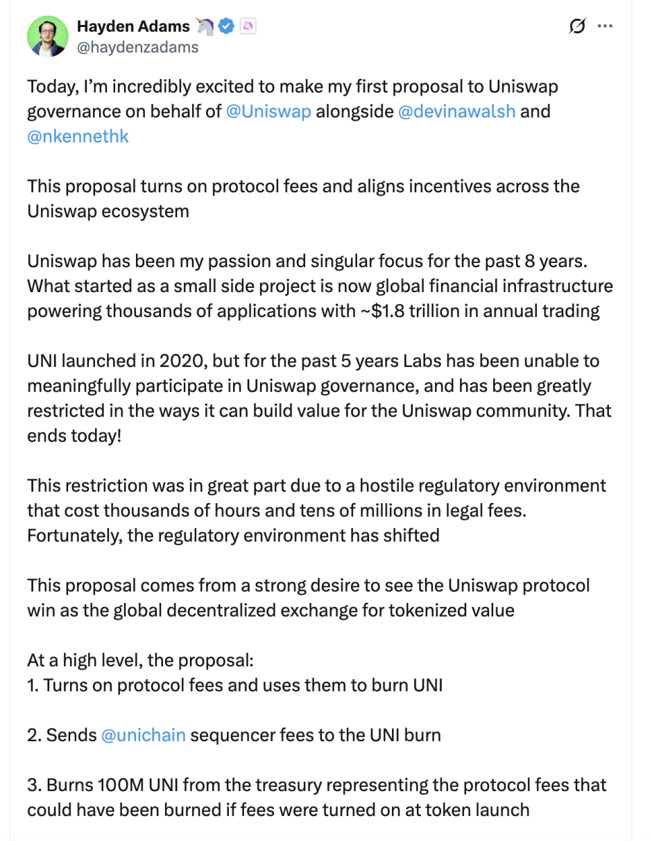 Uniswap CEO Hayden Adams近日公布了其首个治理提案,内容涉及启用协议费用、销毁UNI代币、增加Unichain费用等多项措施,使UNI代币转向通缩模型。 若提案通过,Uniswap协议预计每年将产生约4.6亿至5.1亿美元的资金用于回购UNI,此规模将成为代币价格的强大支撑。提案的内容具体如下: