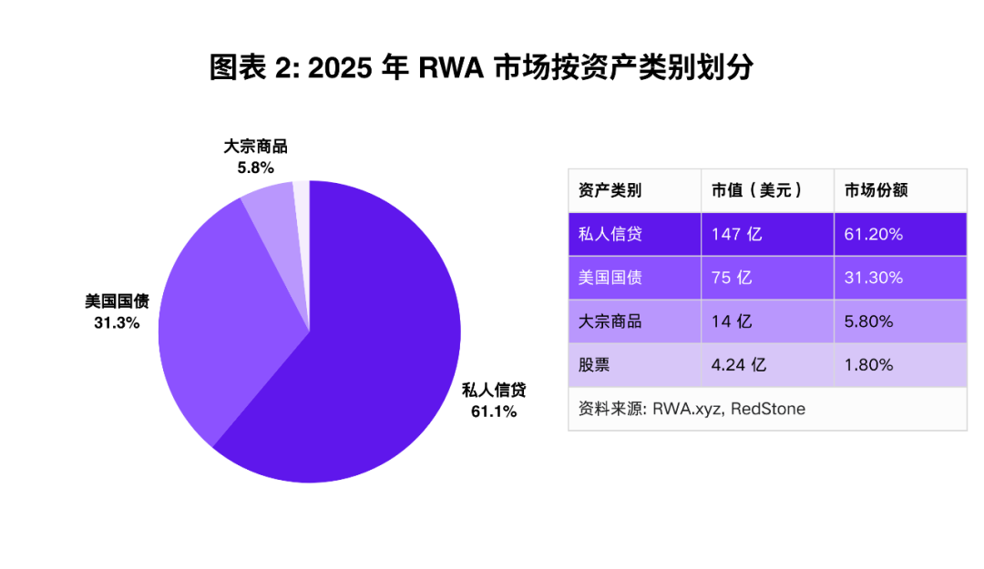 截至 2025 年中,RWA 市场已发展成为一个价值超过 240 亿美元的生态系统,由特定资产类别和区块链网络主导[12]。