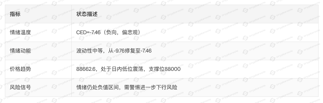 总体情绪走势:过去24小时内,BTC市场情绪呈现明显的负向波动特征。CED值从初始的-0.49持续下行至-7.46,整体情绪偏负面,市场信心相对疲弱。