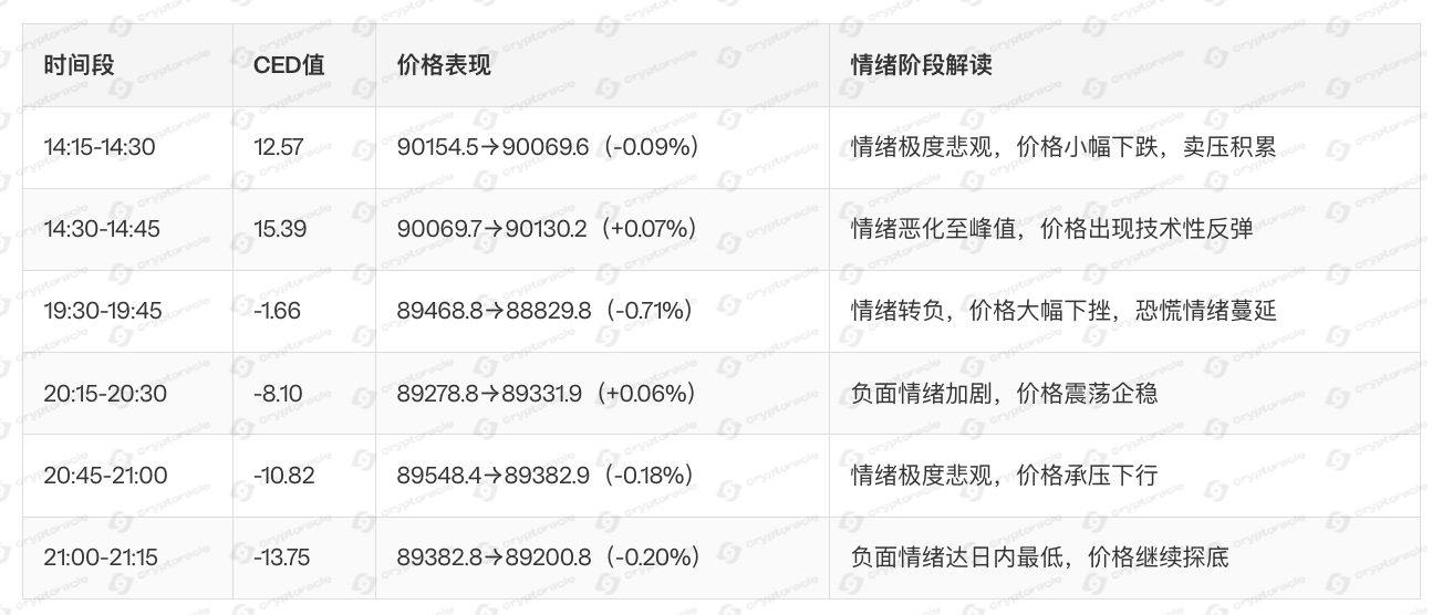 日内情绪变化节奏:上午情绪相对平稳(CED在±3区间波动),午后情绪快速恶化(14:00后CED突破10),晚间情绪极端化(20:00后CED跌破-10),尾盘情绪略有修复但仍处负值区间。