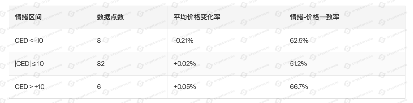 趋势结论:极端情绪区间(|CED|>10)价格波动明显放大,负面情绪区间(CED<-10)价格下跌概率较高(62.5%),显示极端悲观情绪往往预示价格下行风险。