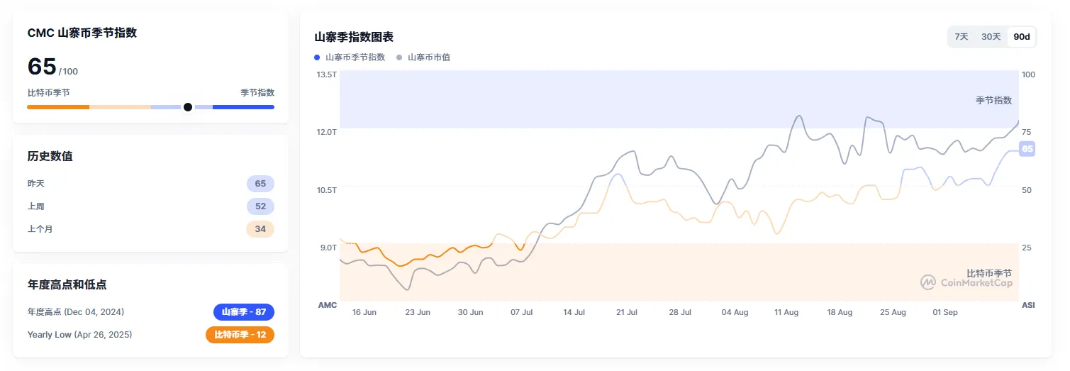 山寨指数:本周五山寨指数65,较上周大幅上升,相比较主流币btc强不少。