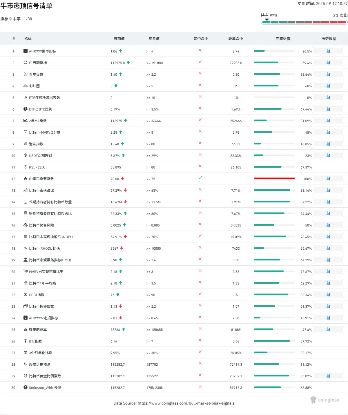 逃顶指标:逃顶合集方面本周:山寨币季节指数显示见顶出现,其它指标未出现,本周确实出现了一些极端波动代币,但是市场分化巨大,至少对涨幅较大代币确实需要保持谨慎。