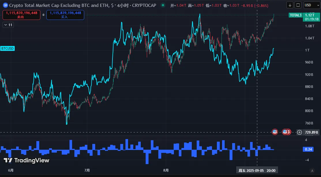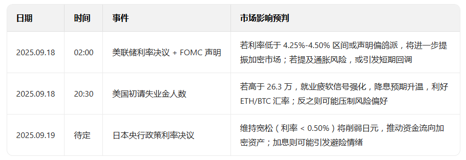 美联储 9 月降息预期已基本落地,短期流动性宽松推动加密市场情绪回暖 —— 比特币(BTC)逼近 11.7 万美元关键阻力位,以太坊(ETH)补涨动能凸显;ETF 资金大幅回流、稳定币增发边际回暖,但山寨币市场呈现 “结构性行情”,小市值代币短期爆发与整体流动性收缩并存。当前市场处于 “宏观利好支撑 + 局部风险积累” 阶段,需重点关注美联储议息会议细节及主流币筹码稳定性。